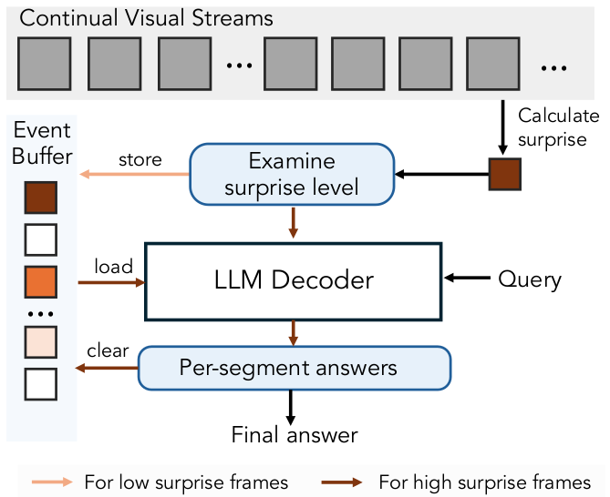 在 VSI-SUPER Count (VSC) 基准中,我们检查了一个简单的设置,其中惊奇用于分割连续的视觉输入,识别场景变化作为划分视频流的自然断点,将其划分为空间连贯 的片段。这种方法也类似于人类解决问题的过程:在统计大区域内的物体时,人们通常先专注于一个部分,然后再合并结果。这种行为也与"门口效应" [106] 有关,即穿过门口或进入新房间会在记忆中创建一个自然边界。如图 12 所示,模型在事件缓冲区中不断累积帧特征。当检测到高惊奇帧时,缓冲的特征被汇总以产生片段级答案,并且缓冲区被清除以开始新片段。这个循环重复直到视频结束,之后所有片段答案被聚合以形成最终输出。