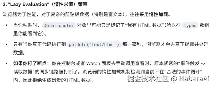 - 在 devtools 里面,如果因为断点导致从交互事件到 getData("text/html") 的时间超过5秒,那么就会拿到一个空字符串。