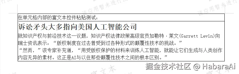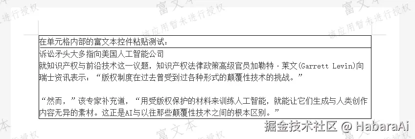 我准备了一个包含表格及单元格里面有富文本模块的模版和一段测试用的富文本,模版及测试粘贴内容如下图所示: