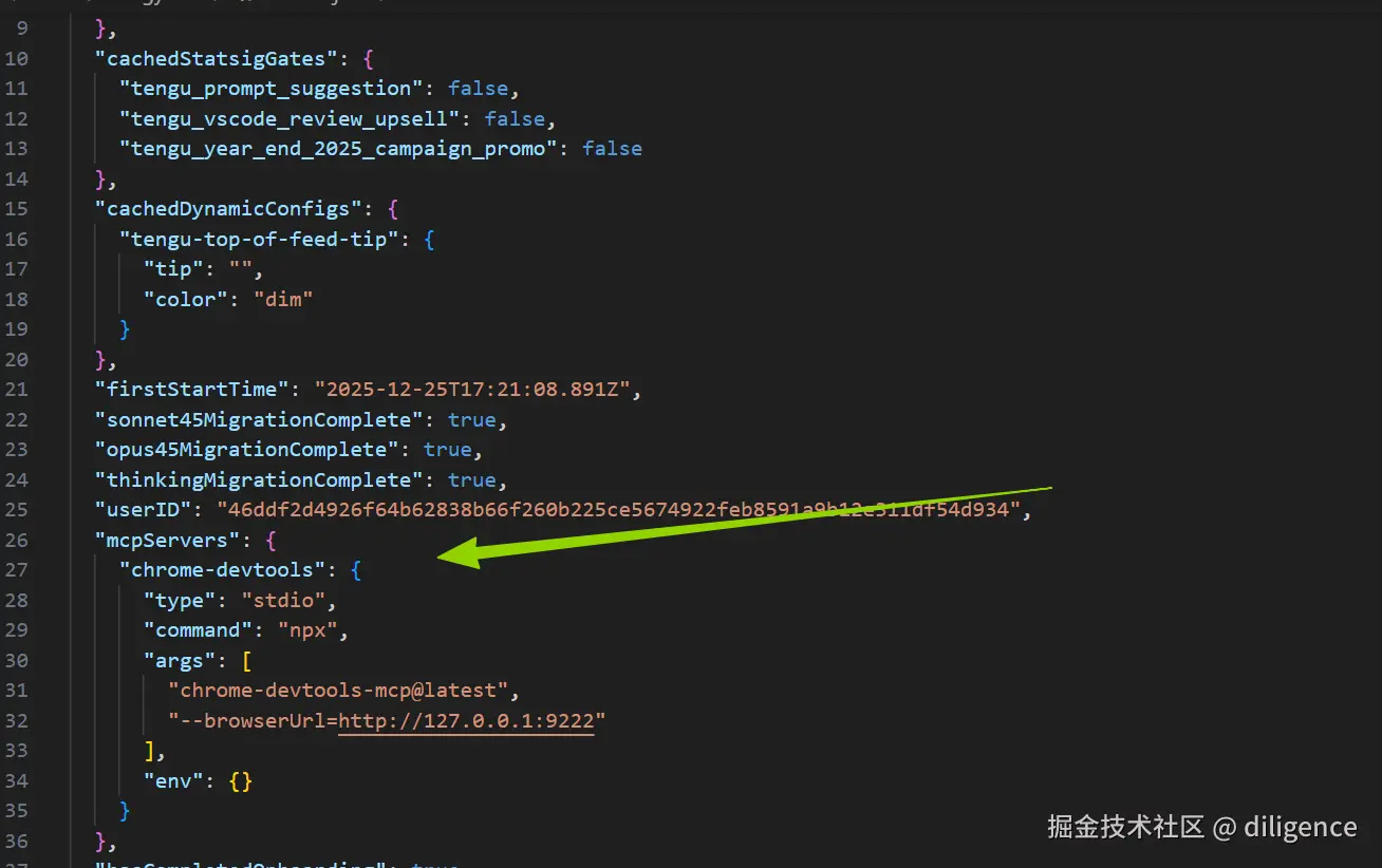 安装后,需要修改配置文件,添加 --browserUrl 参数让 MCP 连接到我们手动启动的 Chrome。
