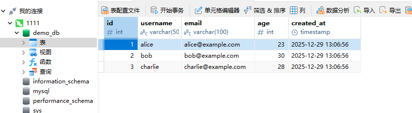 这时候我们进入容器随便给他创建一个表插入几条数据,我直接让ai给我生成了: