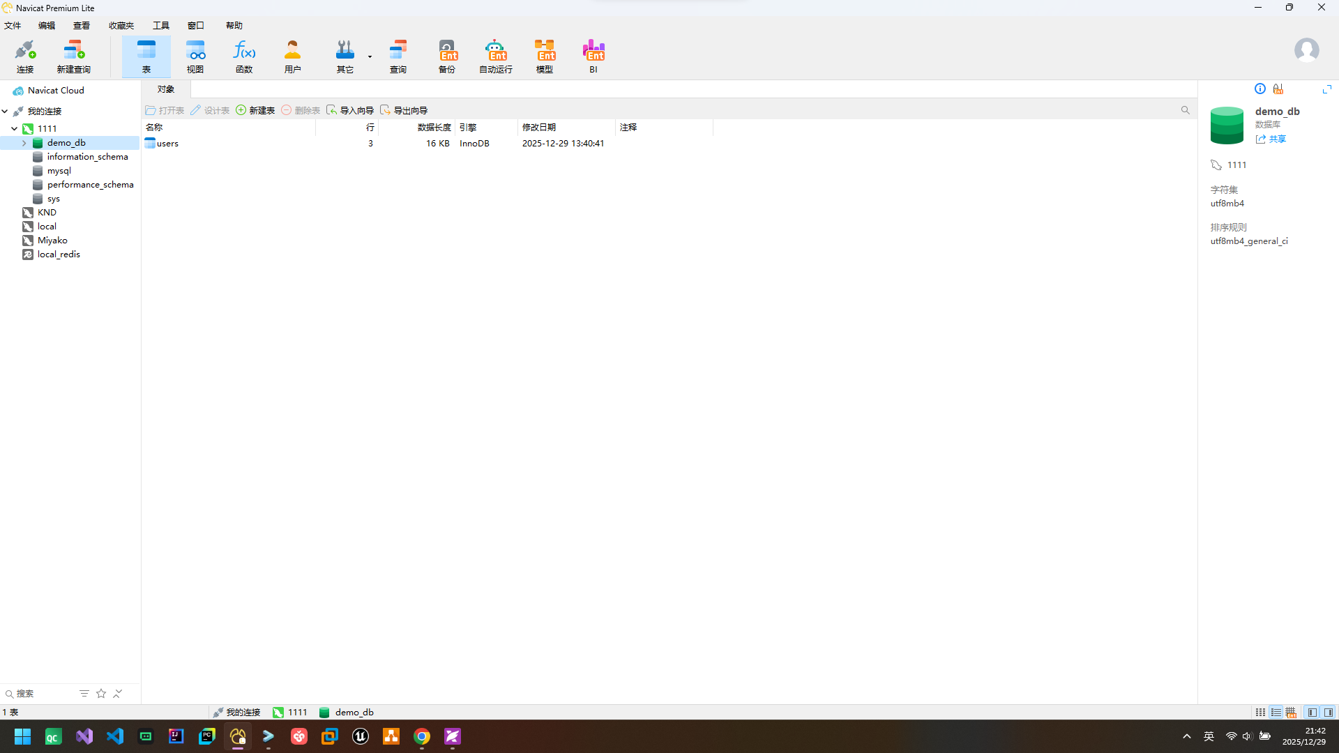 可以在navicat中看到对应数据库与数据: