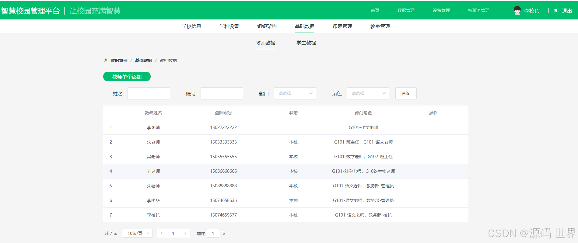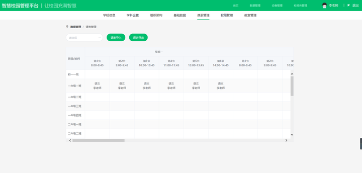 **基础数据管理:**班牌管理后台提供了校、班两级的基本信息管理,能管理班牌状态、校内角色、班级、以及每个班级的基本教学数据,包括班级成员、课表、教师信息等数据的导入、修改和删除。