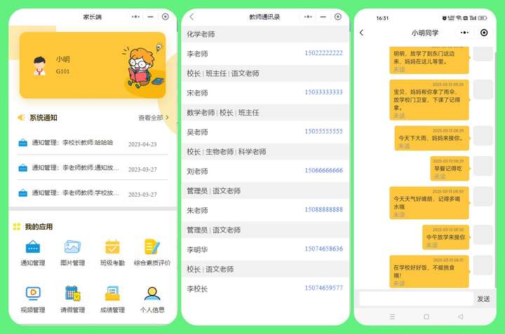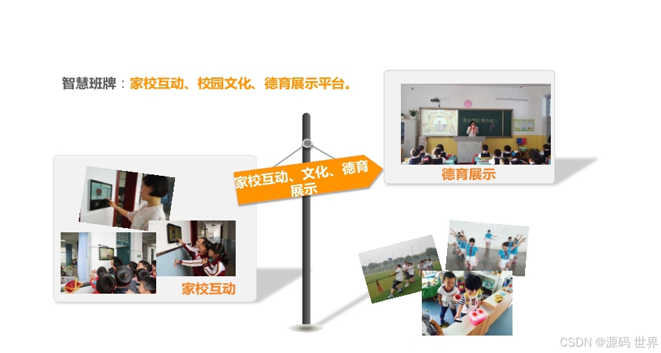 后台数据统一实现家校互动功能,支持学生在班牌上给家长留言,进行家校互动可支持家长在手机端动态接收校园资讯,通知可支持家长查看学生课程,值日,文化等图文内容。