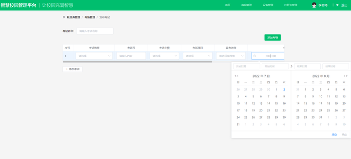 **考试模式:**考试模式下,电子班牌展示考场名称、号码、考试时间、座号编排、考场注意事项等信息,实现考生、监考老师、巡考员等角色通过刷卡或人脸识别方式进行考试管理。