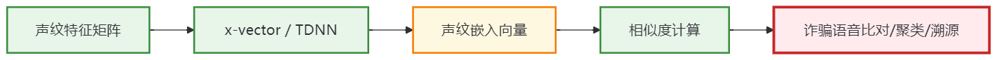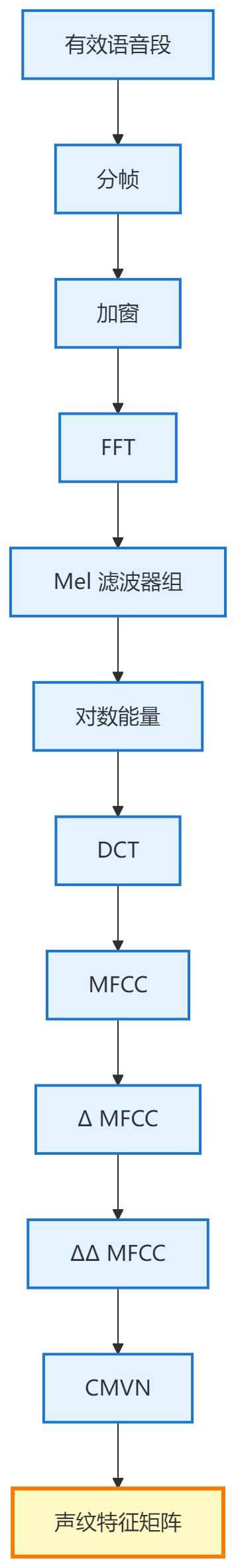 语音采集 → 前端降噪增强 → 语音活动检测(VAD) → 声纹预处理与特征构建