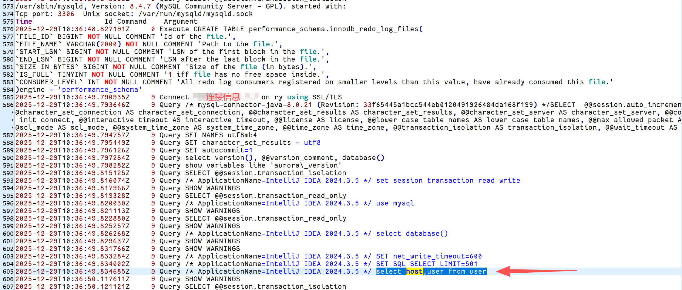 打开日志文件,可以连接信息、SQL语句,都会被记录下来。
