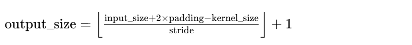 (32+2∗1−3)/1+1=32 → 输出尺寸 32(和输入一致,即 same padding)。 - 若 padding=0,stride=2:向下取整 → 输出尺寸 16。