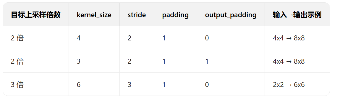 ⚠️ 关键区别:output_padding 是转置卷积独有的参数,用于微调输出尺寸,解决步长 > 1 时的尺寸歧义问题。
