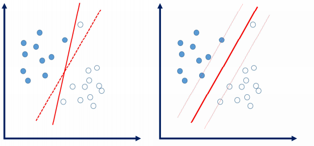 虽然svm和逻辑回归都是处理分类问题的,但两者有很大区别,逻辑回归是概率拟合,使用到了sigmoid函数,看最后概率接近哪边就归类到哪一类,svm与之不同就是,svm追求最大间隔,也就是要找到最优的直线(超平面)并且可以把数据升维。