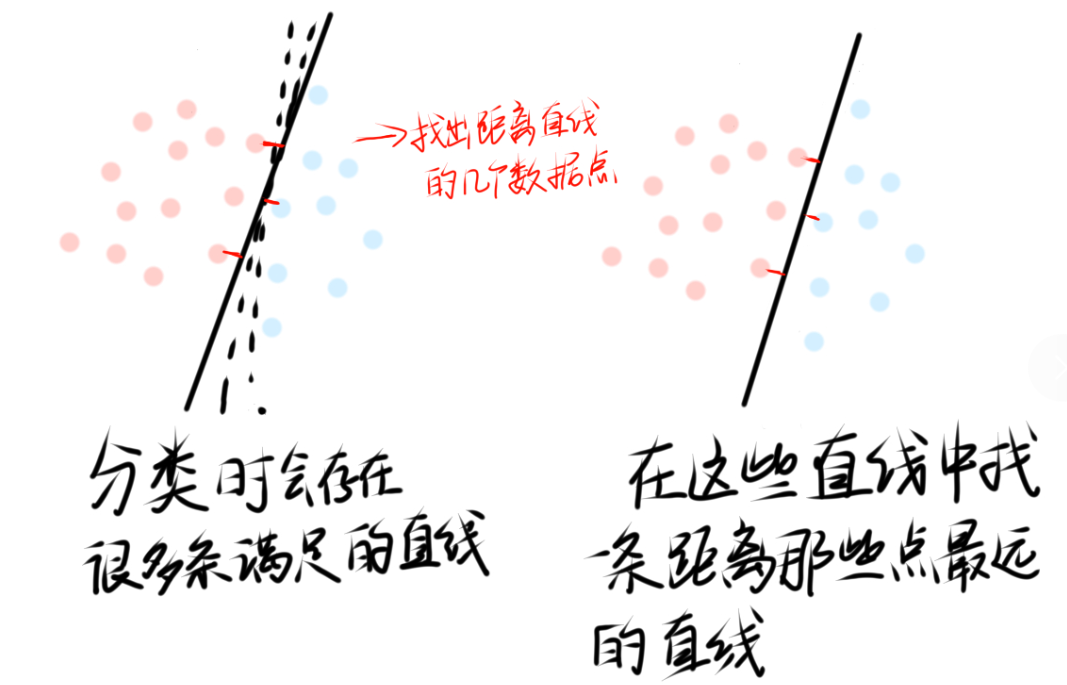 过程:对于一个分类问题svm算法是找出最优的直线,除了能分开类别之外,这里还有两个变量是相互制约的,也就是我们要根据直线找出距离最近的数据点,同时这条直线要离这些数据点距离是最远的,很类似于数学中双变量的问题