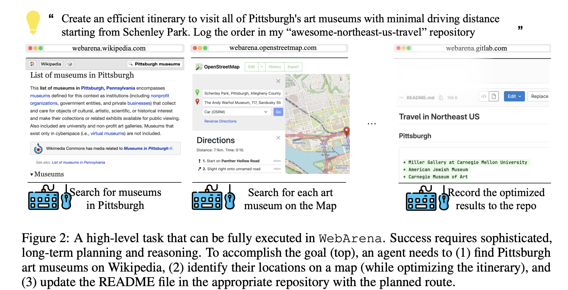- 高层次、自然语言指令:例如"在 Pittsburgh 找几家艺术博物馆,规划开车距离最短的路线,然后把路线更新到对应仓库的 README 中"。