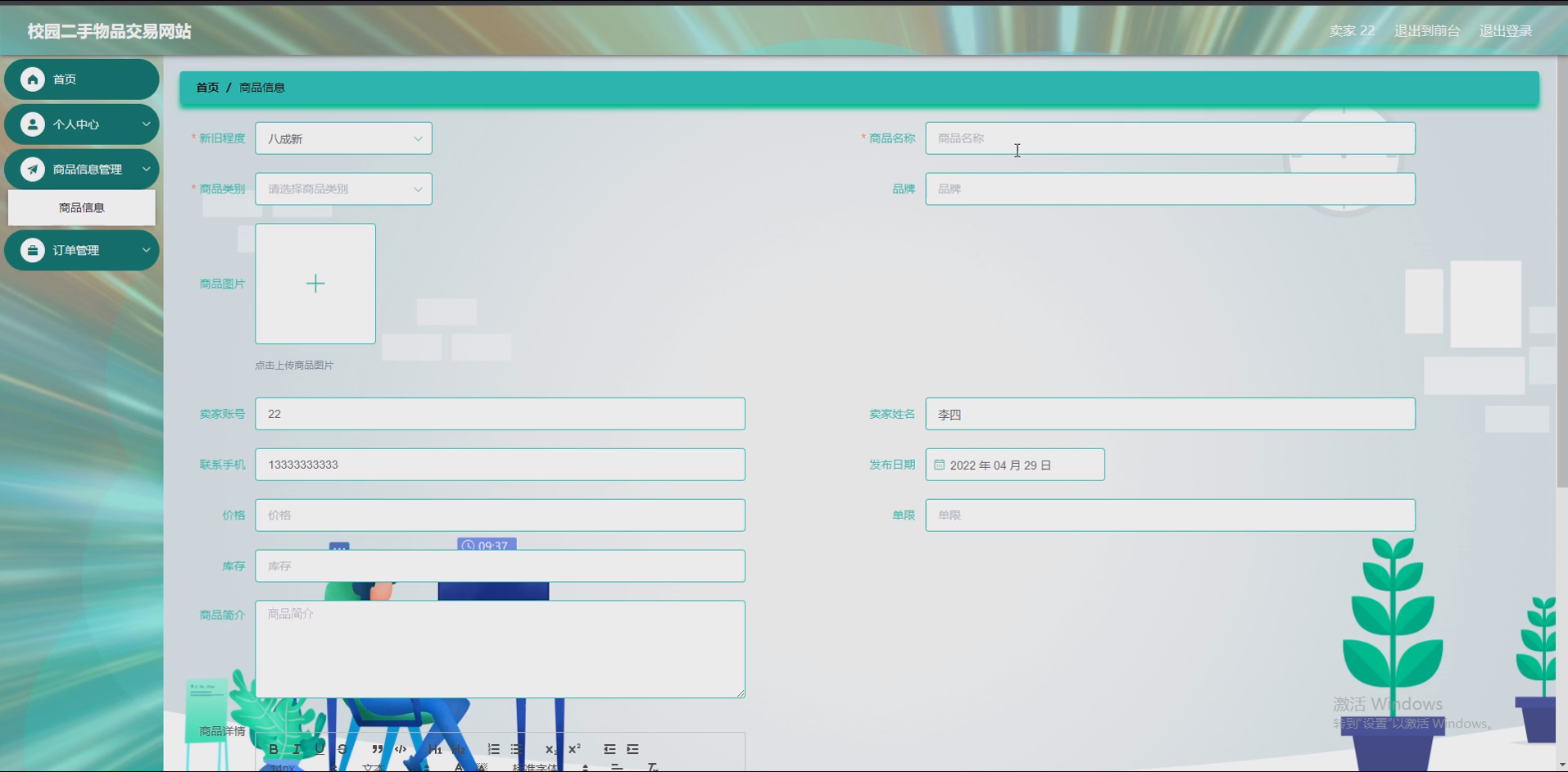 卖家(学生身份兼任)具备商品发布、商品信息编辑与删除、订单管理(接单、发货、取消订单)、交易统计、回复咨询等功能。商品发布需填写详细信息(名称、类别、价格、描述、图片等),并经过系统校验后上线;订单管理模块实时同步交易状态,方便卖家跟进交易进度。