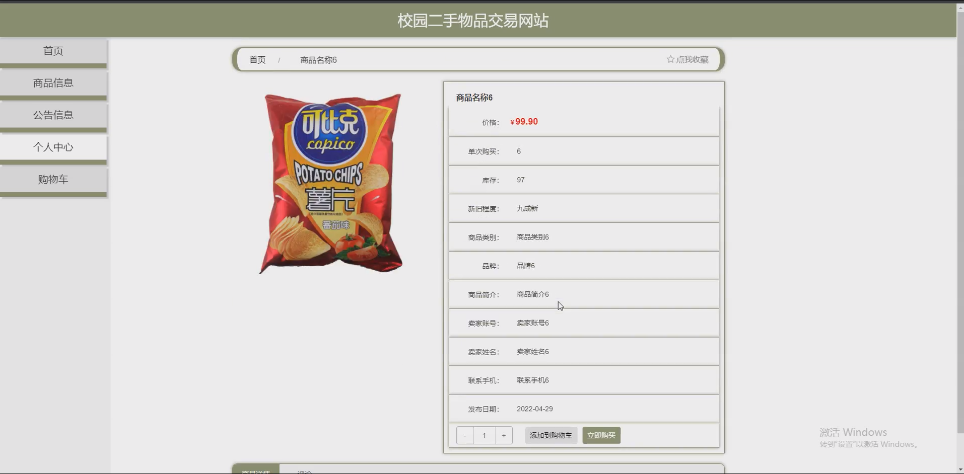 实现商品信息的全生命周期管理,包括商品发布、审核、展示、编辑、删除、下架等功能。系统支持多格式商品图片上传与预览,商品详情页展示完整信息(基本属性、卖家信息、交易规则、评价记录等);同时,设置商品状态管控机制(待审核、已上线、已售出、已下架),确保信息真实性与规范性。