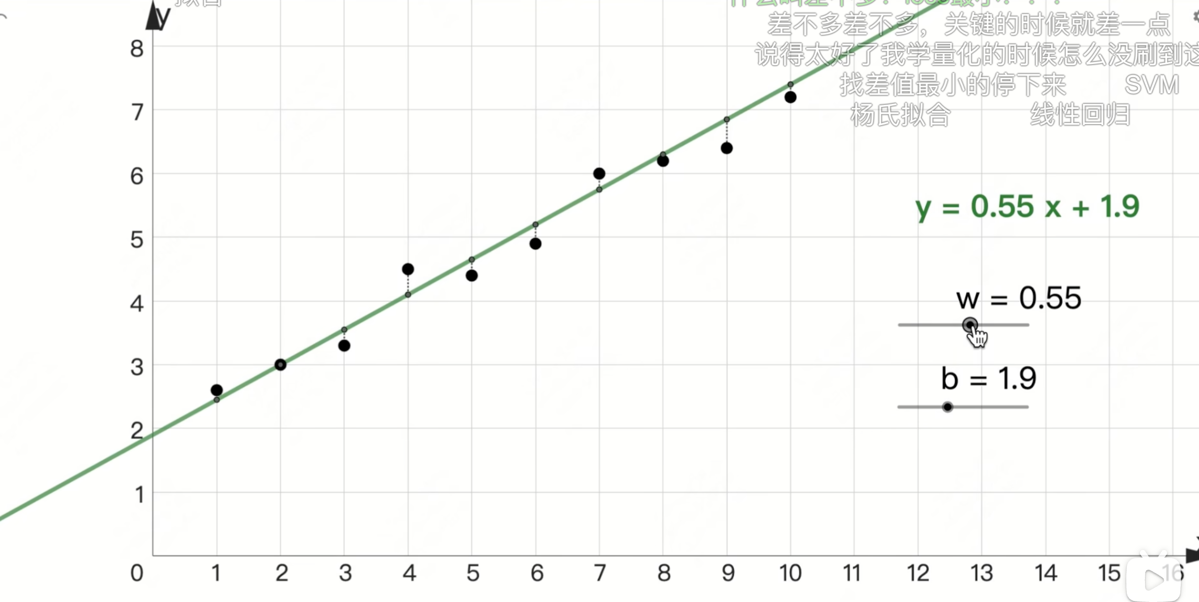 此时这条线y = o.55x+1.9就是我们要找的函数(规律)