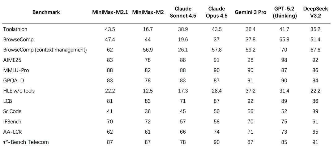在办公场景、长程工具调用和综合智能指数上,MiniMax M2.1 相比 M2 也表现出稳步提升,体现了模型解决更多真实世界复杂任务的能力。