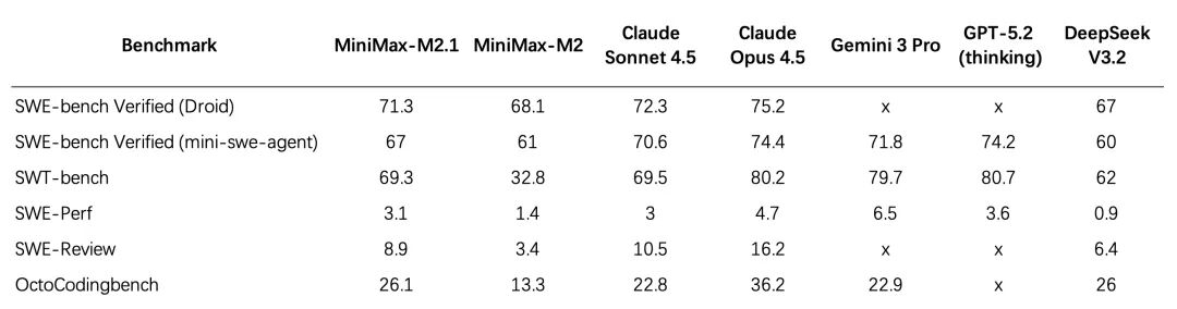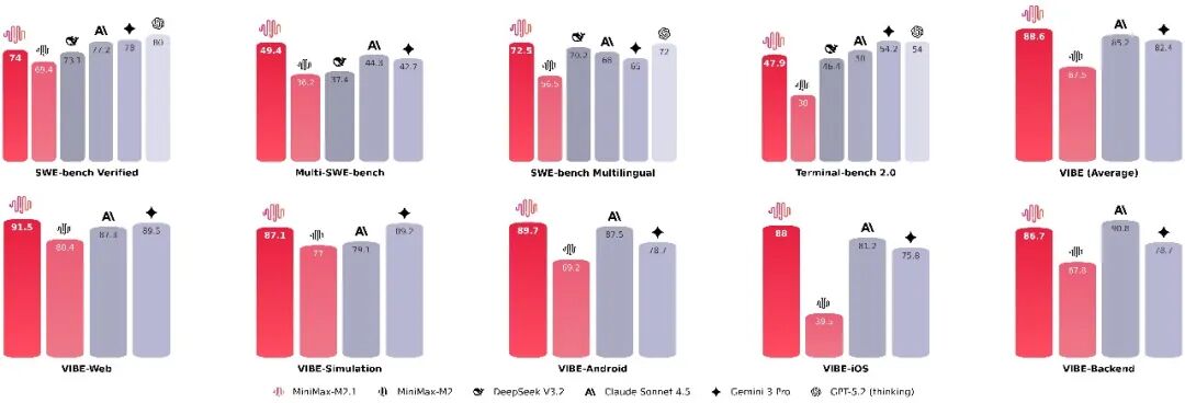 在软件工程相关场景的核心榜单上,MiniMax M2.1 相比于 M2 有了显著的提升,尤其是在多语言场景上,超过 Claude Sonnet 4.5 和 Gemini 3 Pro,并接近 Claude Opus 4.5。