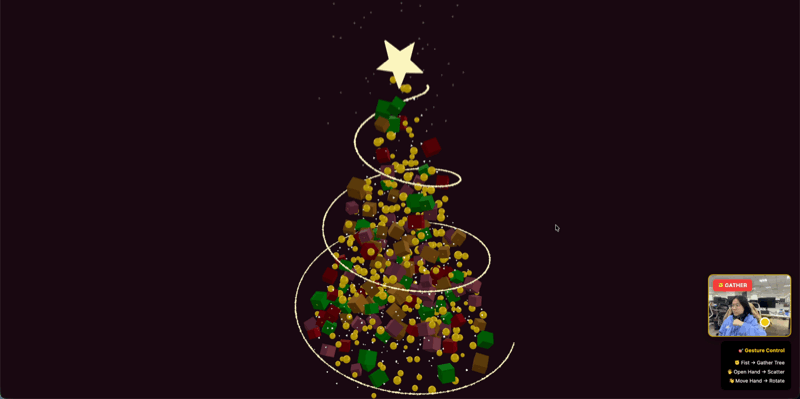 MiniMax M2.1 基于 React Three Fiber 与 InstancedMesh 构建的"3D 梦幻圣诞树",成功渲染 7000+ 实例,支持手势交互与复杂粒子动画,展现高难度 3D 渲染能力。