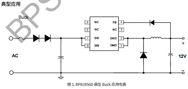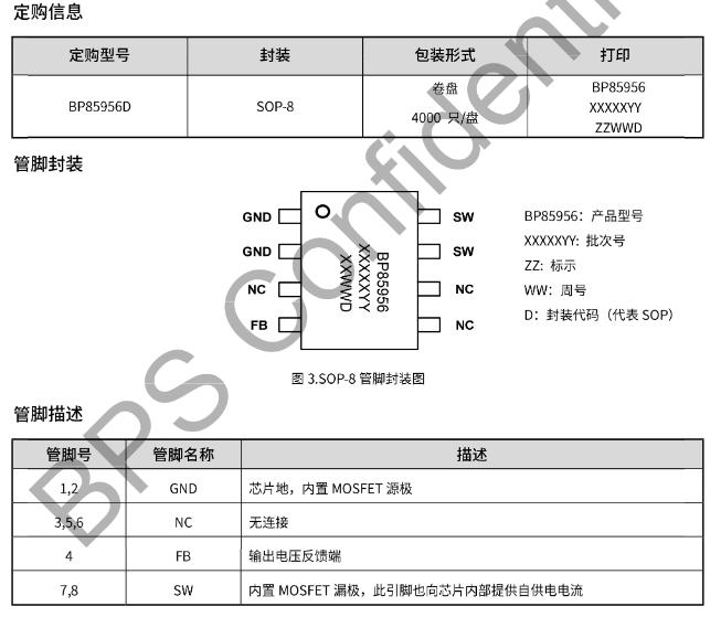 SOP-8封装,丝印"BP85956D"下面还有一行小字"YYWWX",内部批次码。管脚定义如下(顶视图逆时针):
