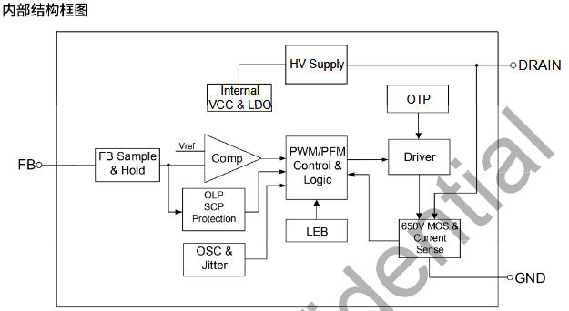 芯片耐压650 V,但Vcc LDO最大仅9 V,因此母线>18 V需外加9 V稳压管到Vcc,或辅助绕组供电。