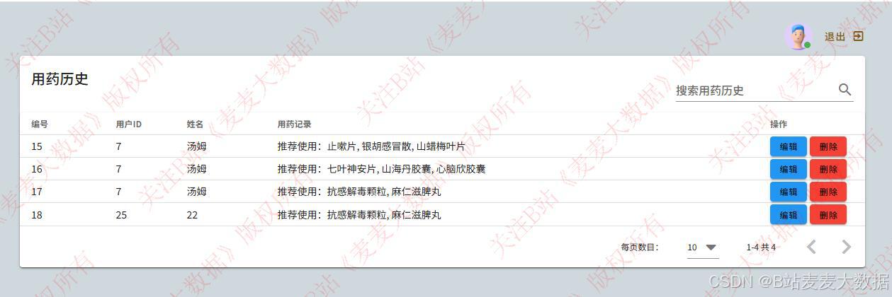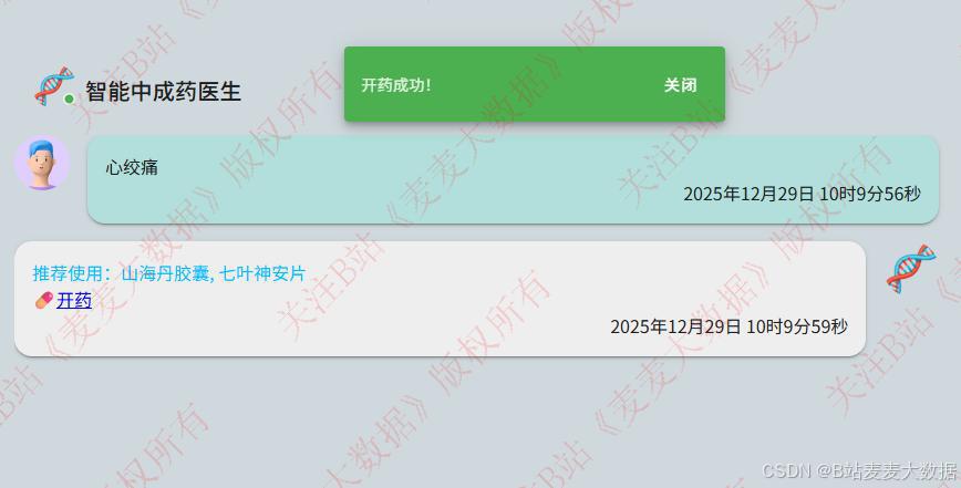 在智能推荐页面,用户点击推荐的药物后,进入在线开药页面。用户可填写购买数量等信息,确认订单后,系统会将用药记录写入MySQL数据库的"用药历史"表中。同时,系统会为用户生成药品的购买链接或提供购买指引。