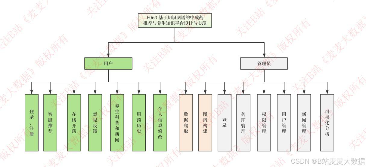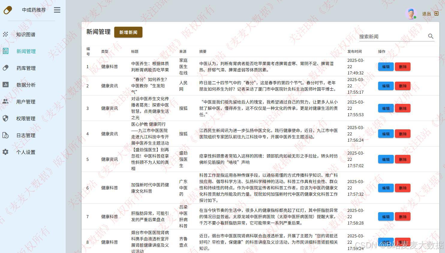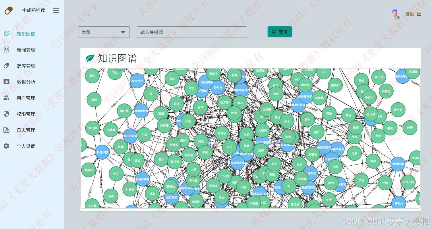 系统简介:本系统是一个基于Vue+Flask+MySQL+Neo4j构建的基于知识图谱的中成药推荐与养生知识平台 。其核心功能围绕智能医药推荐、养生知识传播与后台数据管理。主要功能模块包括:用户端的智能推荐、在线开药、养生内容浏览与互动,以及管理员端的知识图谱构建、药库管理、新闻管理、用户管理与数据可视化分析。