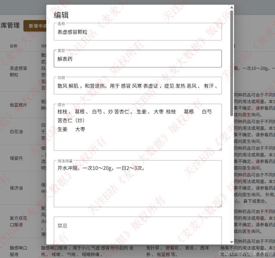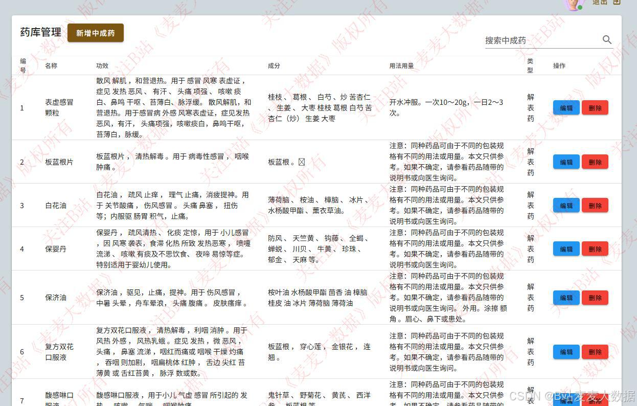 管理员可以对中成药库进行管理。通过增删改查操作,可以维护药品信息,如药品名称、药品成分、主要功效、适应症、禁忌症等,数据存储于MySQL的"药库"表中。