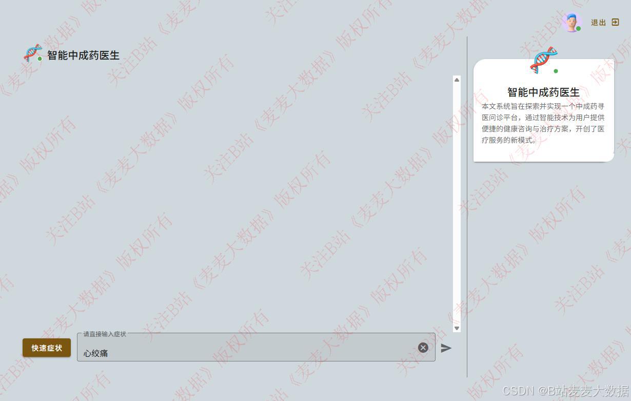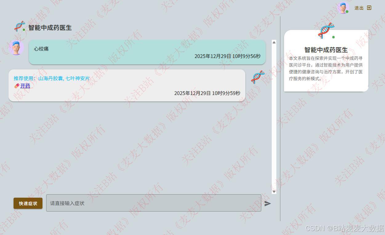 用户在输入框中描述自己的症状(如"嗓子疼"、"咳嗽"等),系统会将这些文本输入到paraphrase-MiniLM-L6-v2模型中,生成一个语义向量。后端在Neo4j图谱中搜索与该向量最相似的节点(代表药物),并返回推荐的药物列表。用户可以根据推荐结果选择开药。