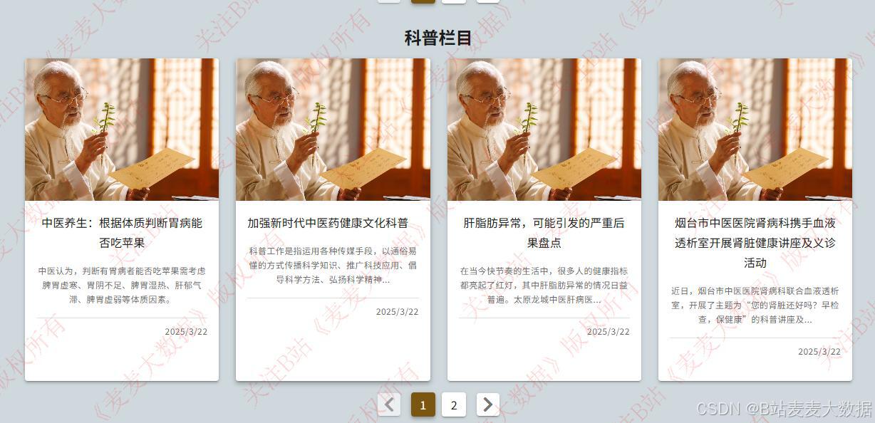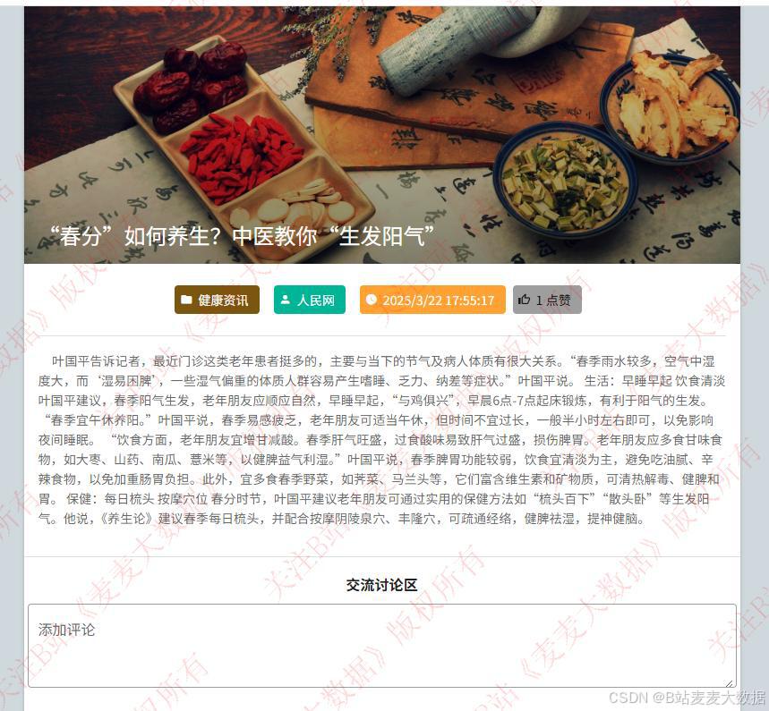 用户可以浏览养生科普和养生新闻列表,点击进入详情页面查看具体内容。在详情页,用户可以对文章进行点赞和评论。系统通过Ajax请求将用户的点赞和评论信息实时提交到后端,存储到数据库中。