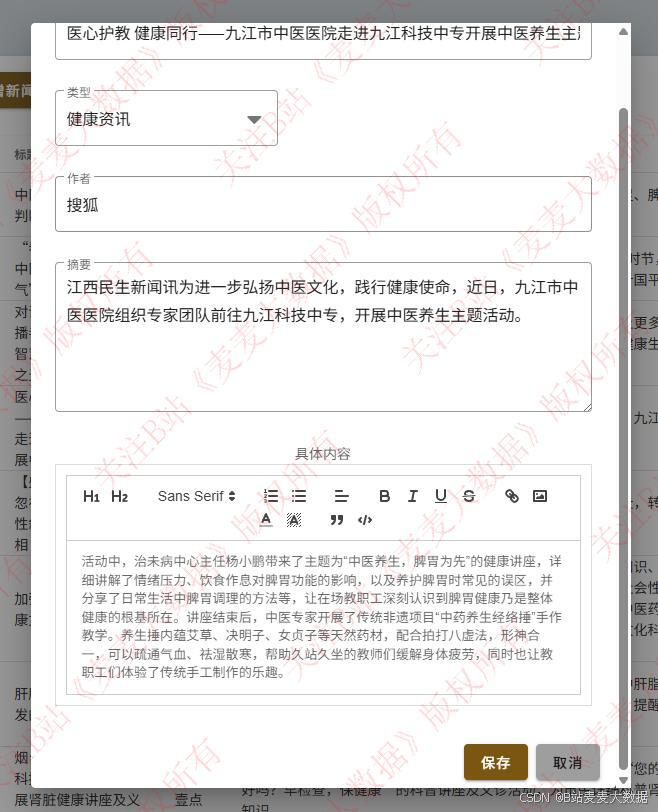 管理员可以管理养生新闻。支持添加、修改、删除新闻,新闻内容支持富文本编辑(如添加图片、链接等)。新闻数据存储于MySQL的"新闻"表中。
