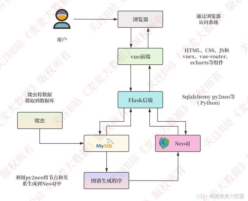 系统架构分为前端、后端和数据层。用户通过浏览器访问前端(Vue)界面,前端通过HTTP请求与Flask后端进行通信。Flask后端负责处理业务逻辑,并与MySQL和Neo4j进行数据交互。MySQL用于存储常规的结构化数据,如用户信息、新闻、用药历史等;Neo4j则负责存储和查询动态的知识图谱数据。系统还包含一个Python爬虫程序,用于从外部网站抓取养生知识,并将其存储到MySQL中,供后续构建知识图谱使用。