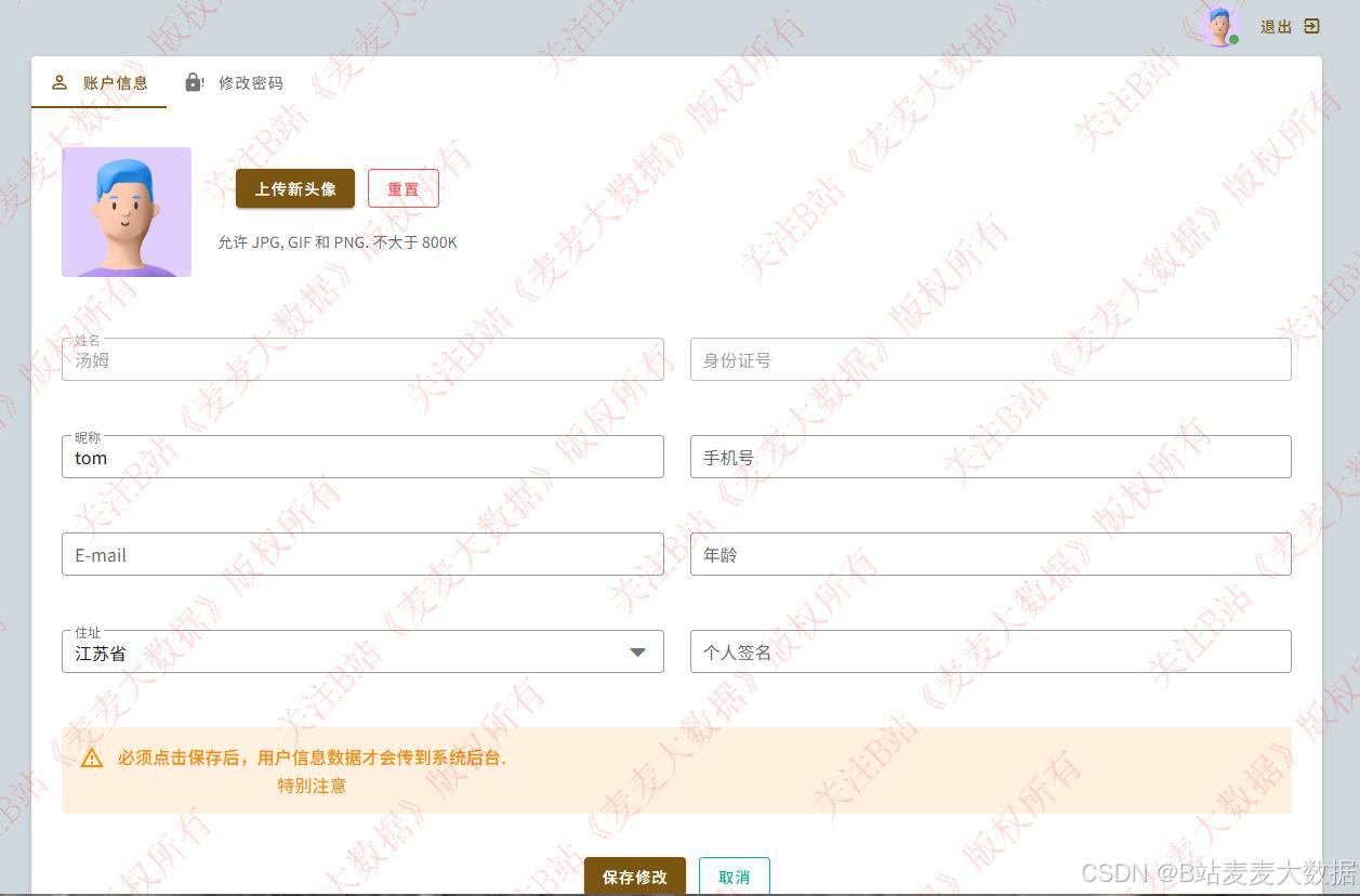 用户信息修改中可以上传头像,完成用户的头像个性化设置,也可以修改用户其他信息。上传头像时,前端使用File API选择本地图片,通过FormData传给后端,后端将图片保存到指定目录,并在数据库中更新用户信息。