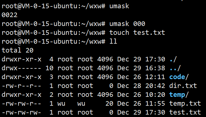 - 但是创建的文件和目录看到的权限往往不是上面这个值,原因就是创建文件或目录的时候还要受到umask的影响。最终权限 = 起始权限 & (~umask)