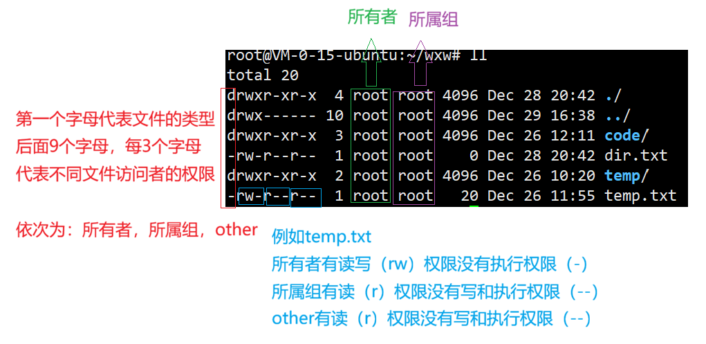 - 读(r):Read对文件而言,具有读取文件内容的权限;对于目录来说,具有浏览该目录信息的权限。