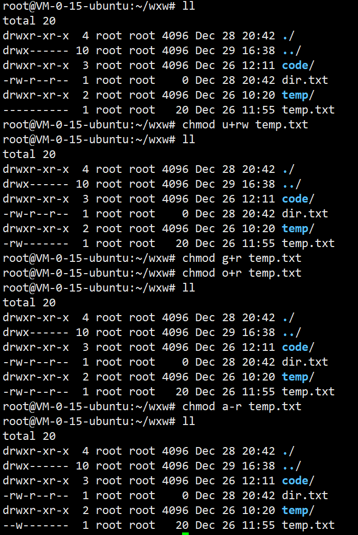 R ->递归修改文件目录的权限(只有文件的拥有者和root才可以改变文件的权限)
