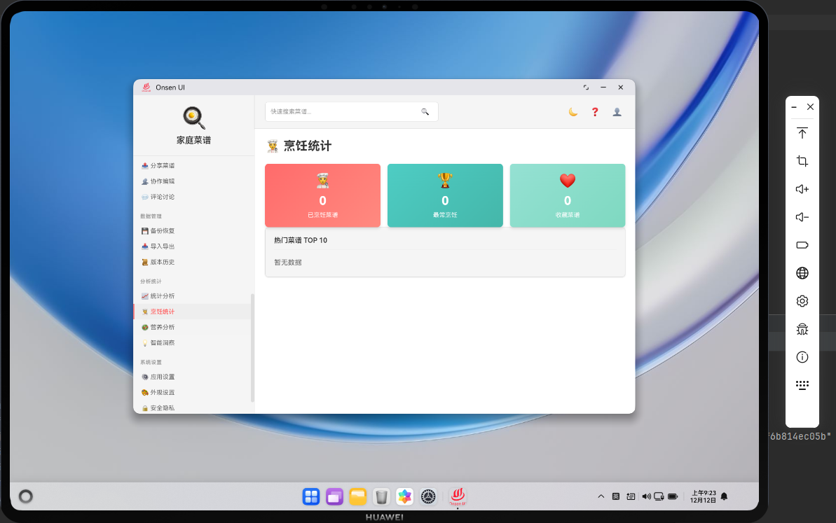 烹饪统计页面从行为维度帮助家庭理解哪些菜被做得最多、哪些菜几乎没被使用。通过 Cordova&OpenHarmony 混合模式,我们在 Web 层维护 viewCount 和 lastViewedAt 等行为字段,并在 ArkTS 层记录更加长期的活跃度数据,为后续趋势分析和智能推荐提供基础。