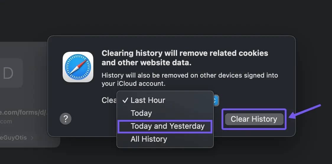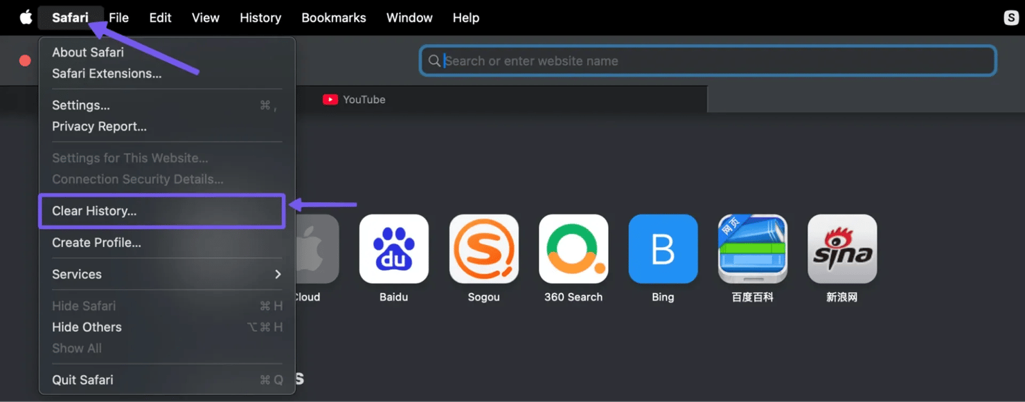 在Safari上,单击Safari ,然后单击清除历史记录。将出现一个弹出窗口供你选择删除缓存数据的时间范围。