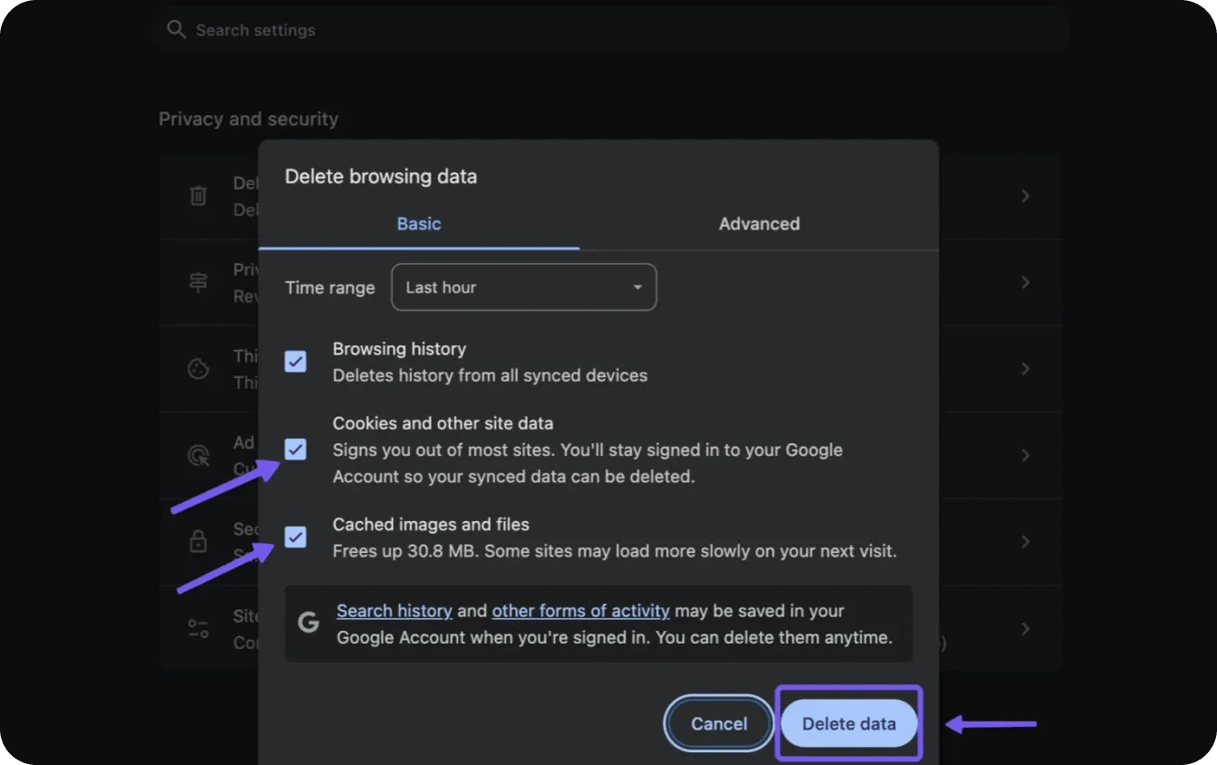 现在,你需要勾选缓存的图像和文件 选项,然后单击删除数据。