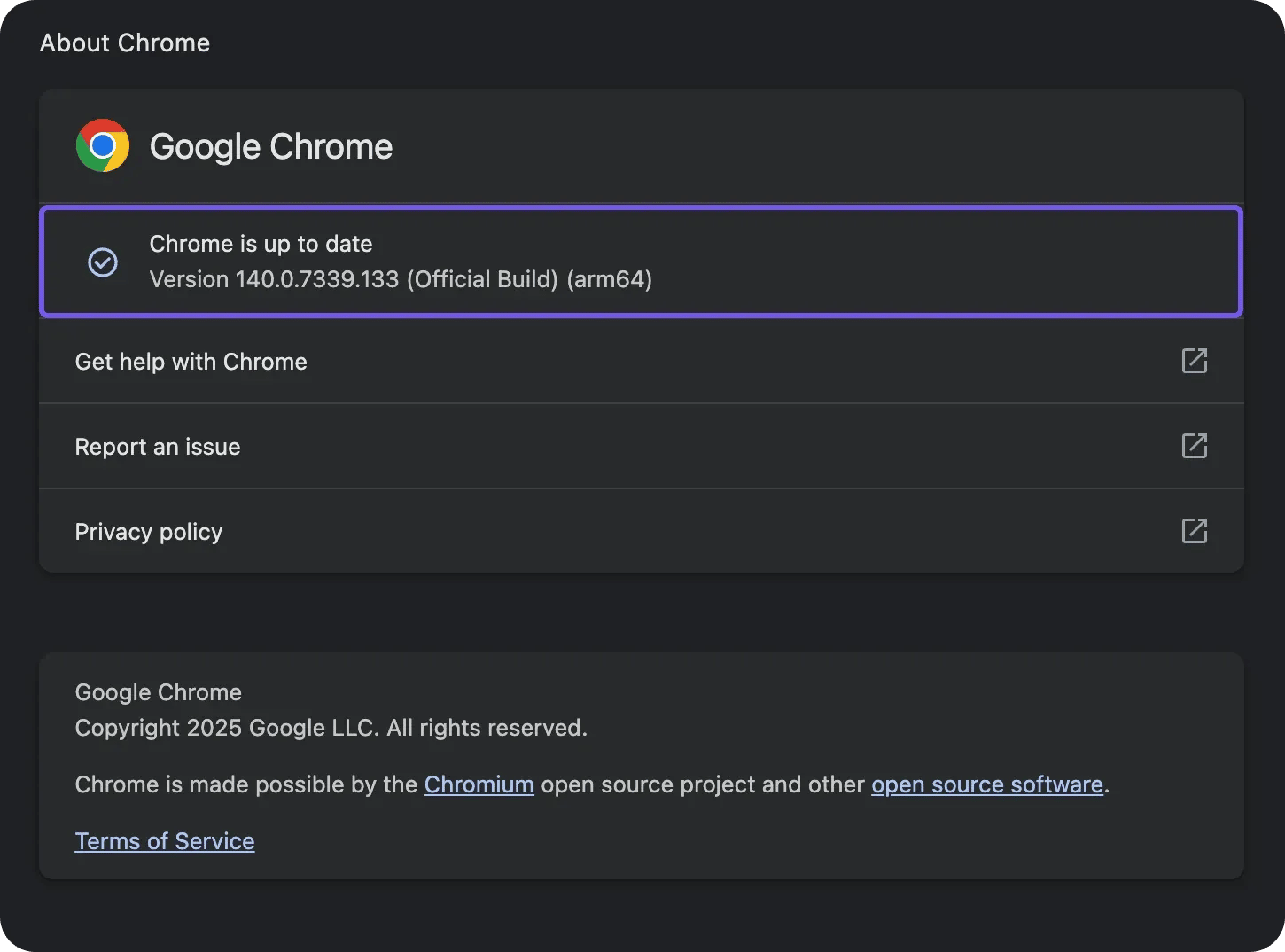 在Chrome上,单击菜单并转到帮助 ,然后单击关于Google Chrome以检查更新。更新浏览器可确保你拥有最新的修复程序和兼容性改进。