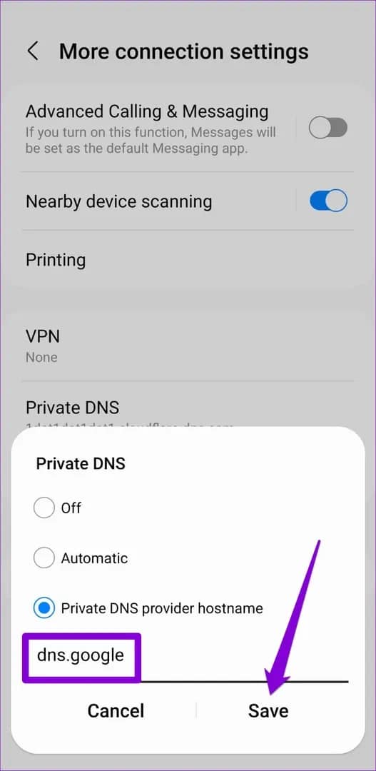 选择"私有DNS提供商主机名"选项,输入dns.google,然后保存 。