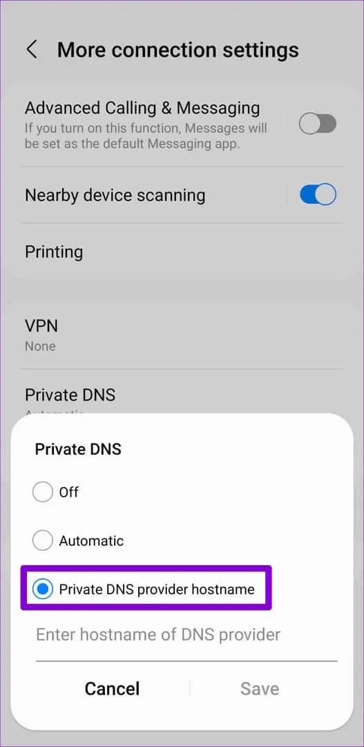 互联网服务提供商(ISP)提供的默认DNS服务器可能存在问题,这就是你收到400错误的原因。如果是这种情况,更改为更稳定的DNS可以修复错误400。要在Android上执行此操作,打开手机上的设置 应用程序,点击连接 ,然后向下滚动以选择私有DNS。