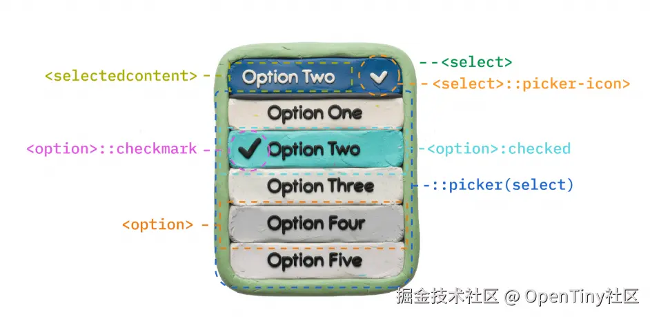 option 和 selectedcontent 的子项,都可以用普通的 css 选择器去分别控制样式。