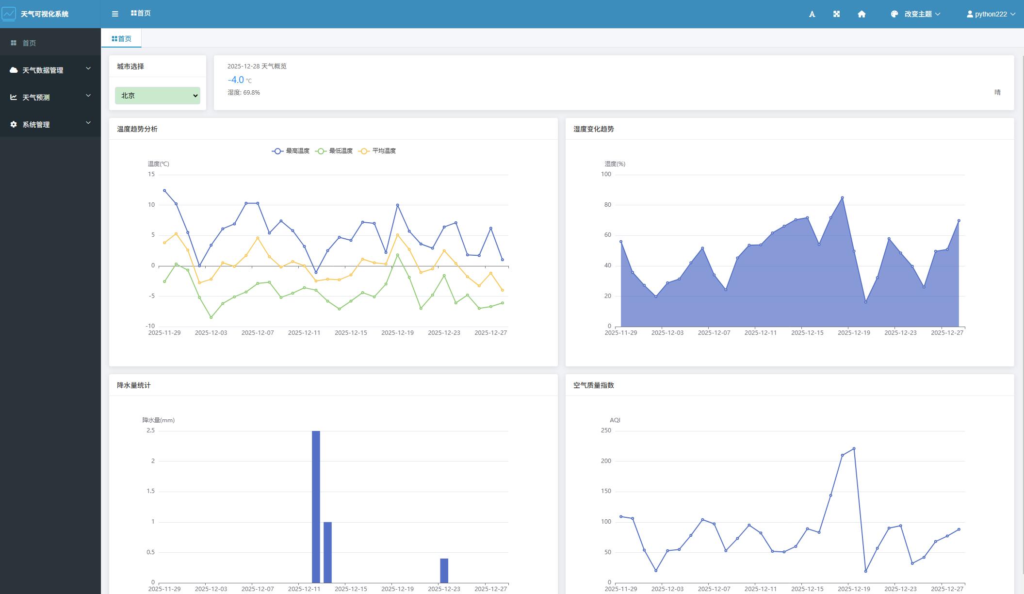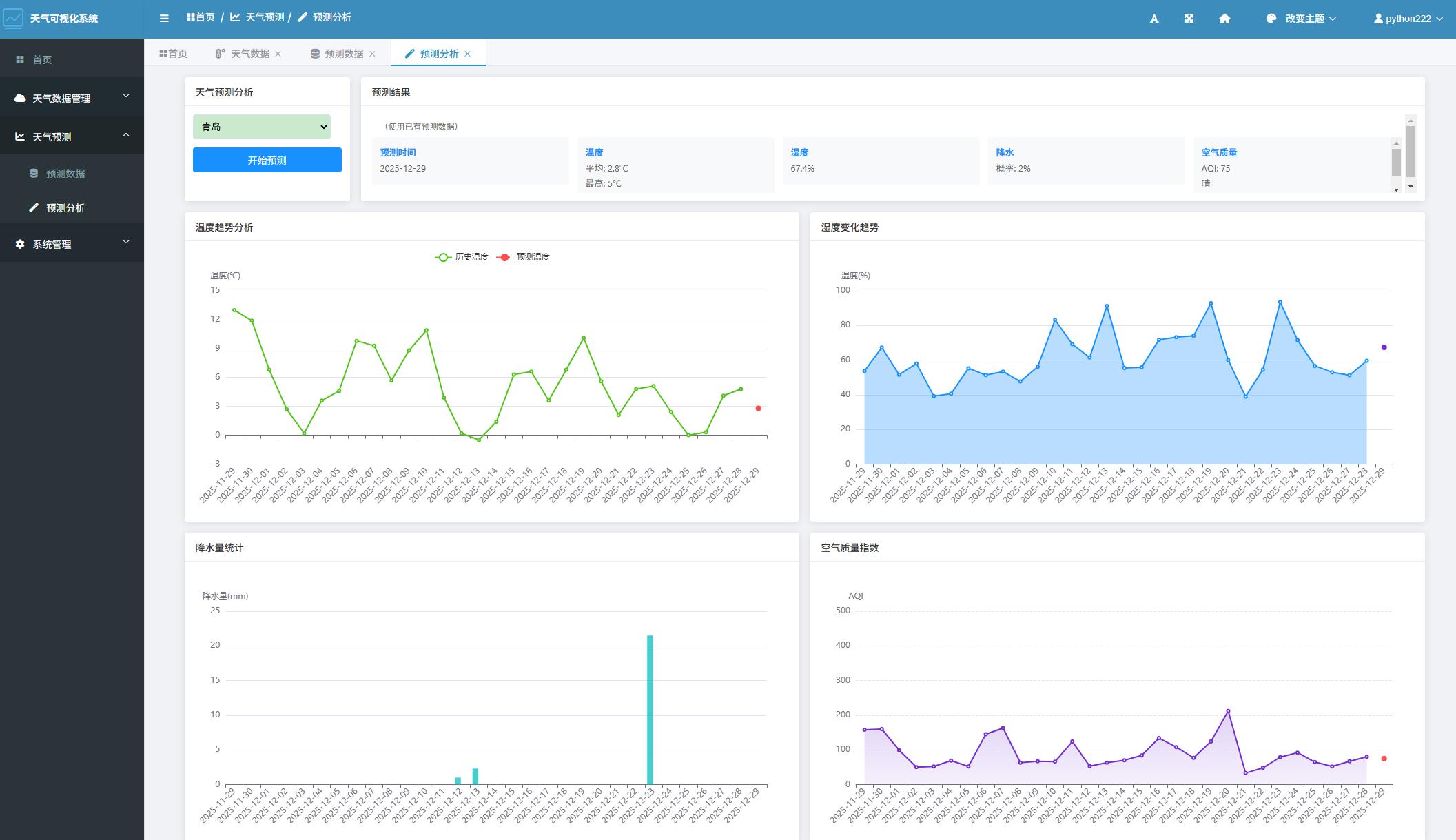 最后,基于Django框架开发前端展示系统,实现天气预报的可视化。用户可以通过友好的界面查询实时天气信息和未来几天内的天气预测。系统还提供多种图表类型,包括折线图和柱状图,帮助用户直观理解天气变化趋势。