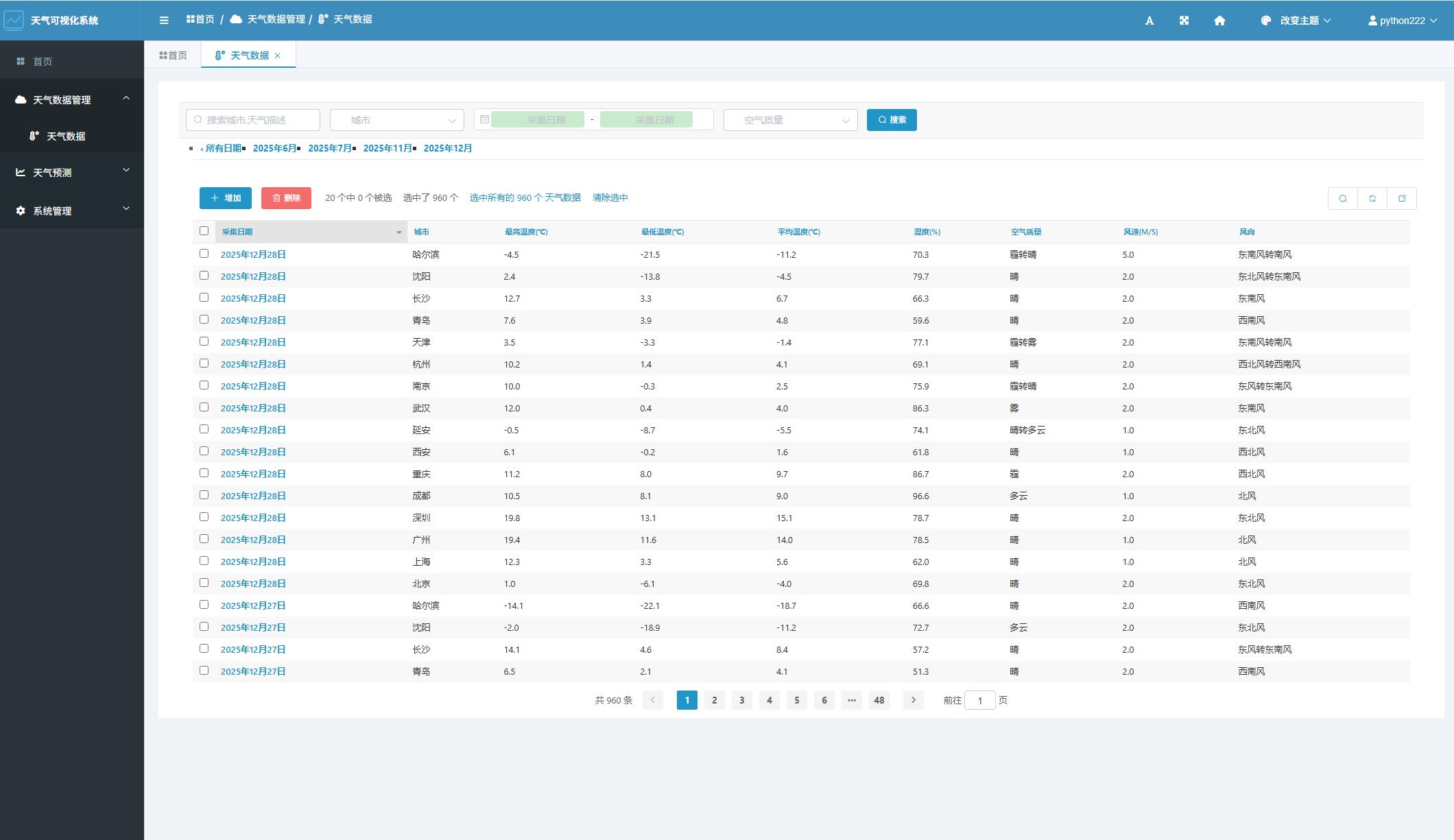大家好,我是java1234_小锋老师,看到一个不错的基于Python的天气预报(天气预测分析)(Django+sklearn机器学习+selenium爬虫)可视化系统【论文+源码+SQL脚本】,分享下哈。