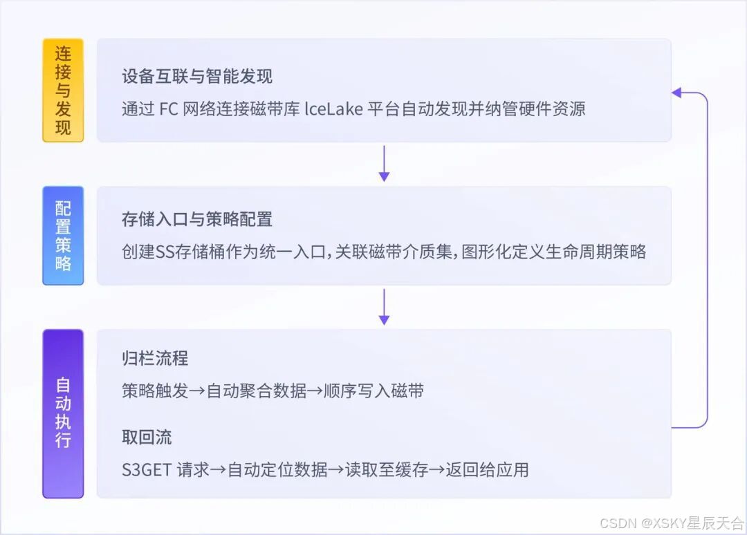 XSKY IceLake 冰湖构建了标准化、流程化的带库归档落地体系,全程无需复杂技术介入,三步即可完成全流程部署: