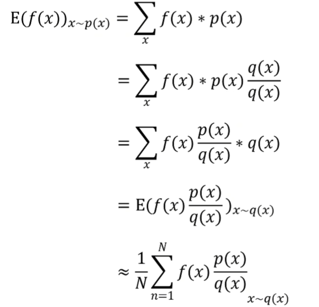 首先了解一下重要性采样 (Importance Sampling):其意义是从分布 q(x) 中采样 x 来求 f(x) 在 p(x) 分布下的期望。
