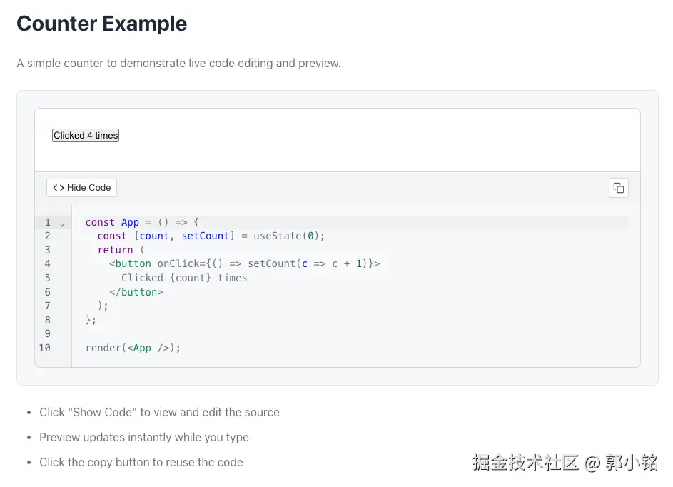 我最近将 react-code-view 进行了重写, 基于 unplugin 让 Markdown 可以直接导入渲染成一个 React 组件. 以下是一个简单示例