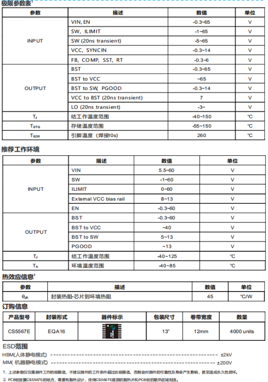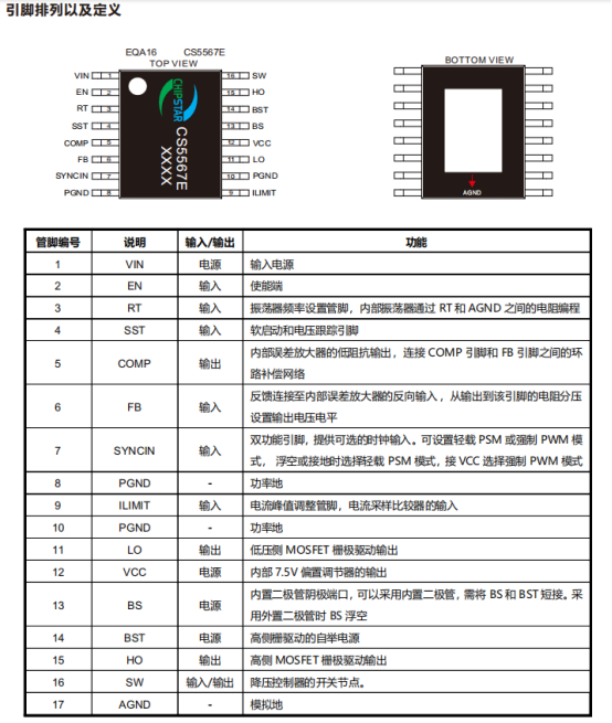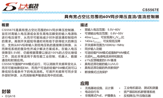 CS5567E是一款具有宽占空比范围的高性能同步降压控制器,输入电压范围5.5~60V,输出电压可调0.8~55V,适用于无线基础设施、云计算、工业电机驱动、电动自行车、IP摄像头及反相降压/升压稳压器等场景。采用EQA16封装,工作结温-40℃~125℃,环境温度-40℃~85℃,热阻45℃/W,底部带散热片,需搭配PCB散热设计保障高压大电流场景稳定运行。