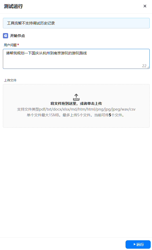 点击运行可以观察每个节点的运行状况以及运行结果,ModelEngine的可视化调试器 打破了工作流的黑匣子,揭示每个节点的处理过程、元数据和输入输出,为深度优化提供依据。