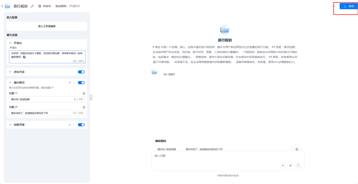 - 需求挖掘:主动询问用户的出发地、目的地、旅行时间、预算、人员构成和兴趣偏好。